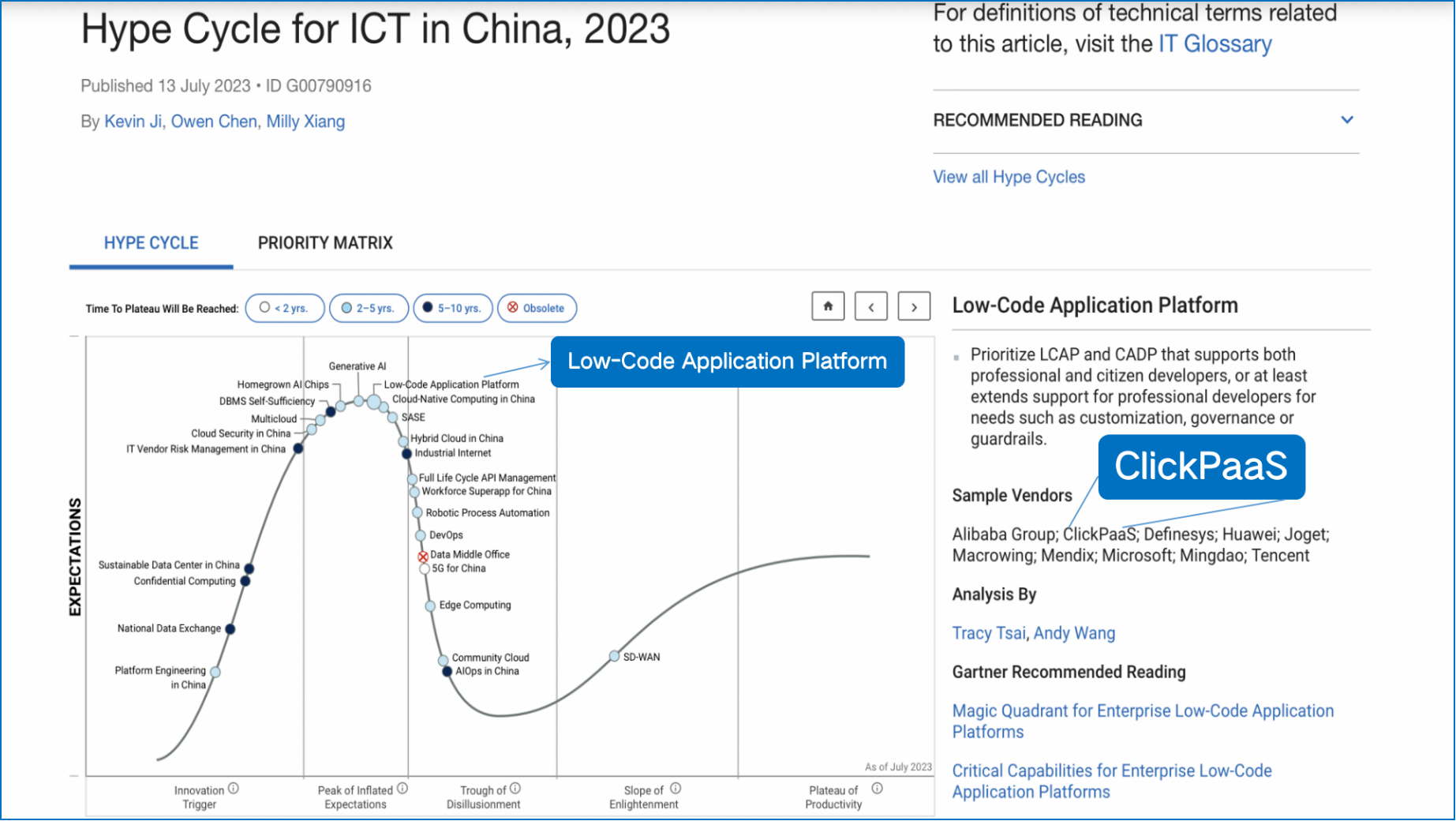 近日,国际权威研究机构Gartner发布了《Hype Cyple for ICT in China,2023(2023年中国ICT技术成熟度曲线)》报告,凯发k8旗舰厅凭借平台的aPaaS+iPaaS+DaaS保障业务系统的一站式设计,多租户、热发布、国际化、信创安全等特性实力登榜,并作为低代码PaaS平台代表厂商TOP2入选本次报告。